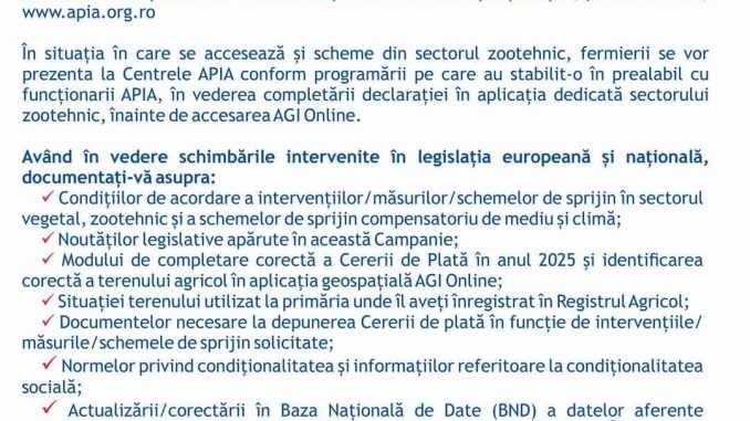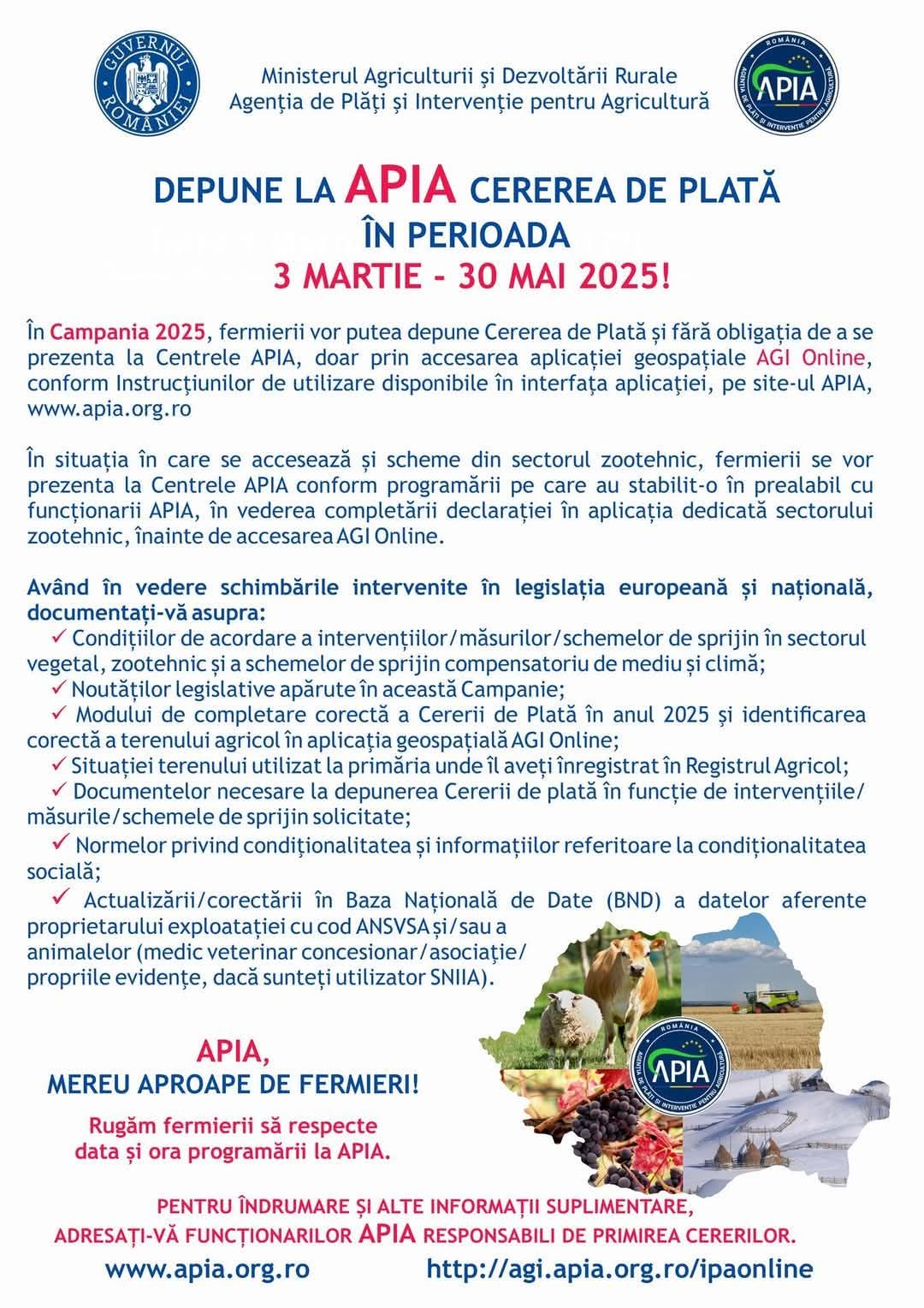 ANUNȚ DEPUNEREA CERERILOR DE PLATA PENTRU A.P.I.A – CAMPANIA 2025